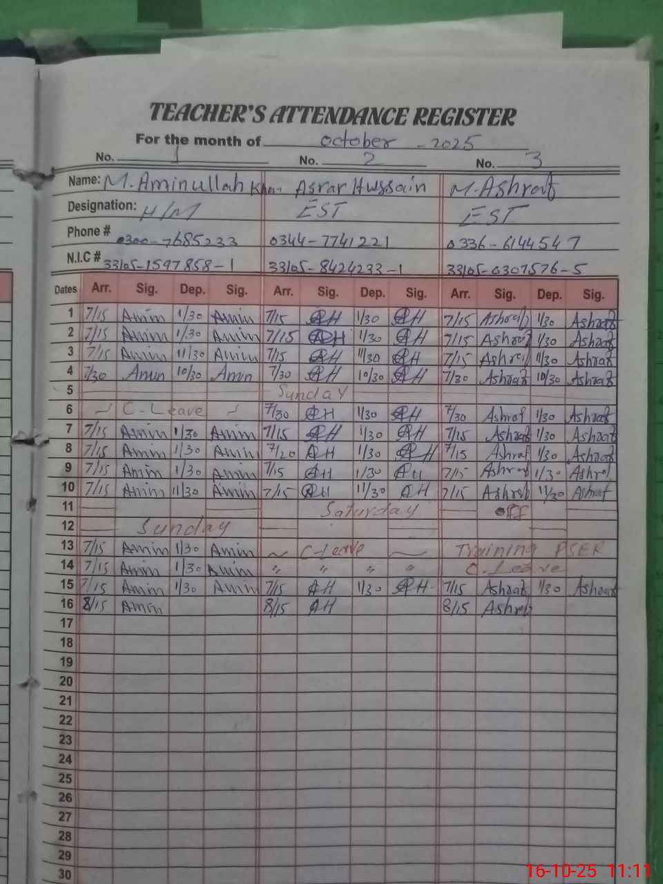 | CNIC | Full Name | Designation | R/C | Absence during last cal. month |