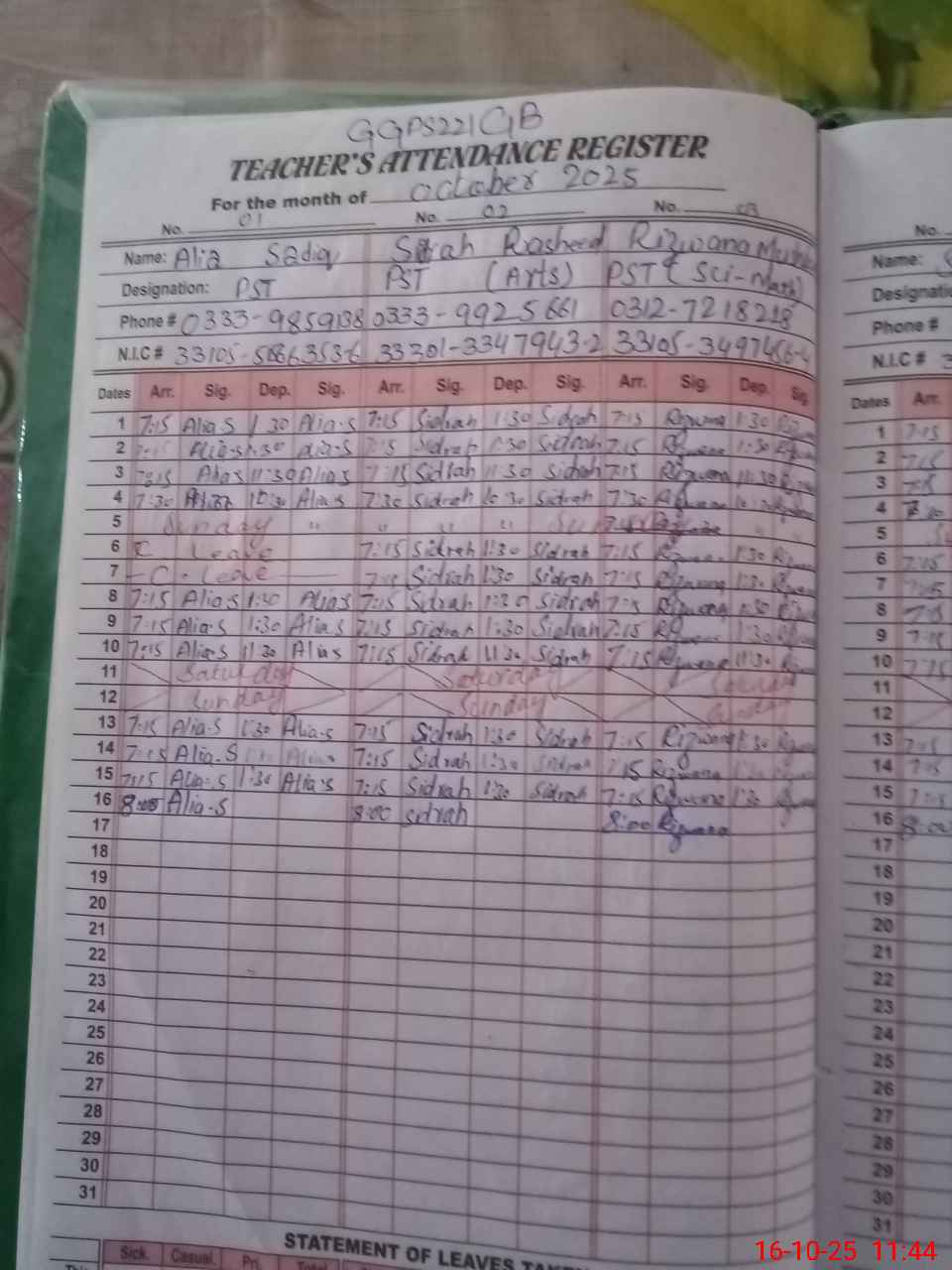 | CNIC | Full Name | Designation | R/C | Absence during last cal. month |