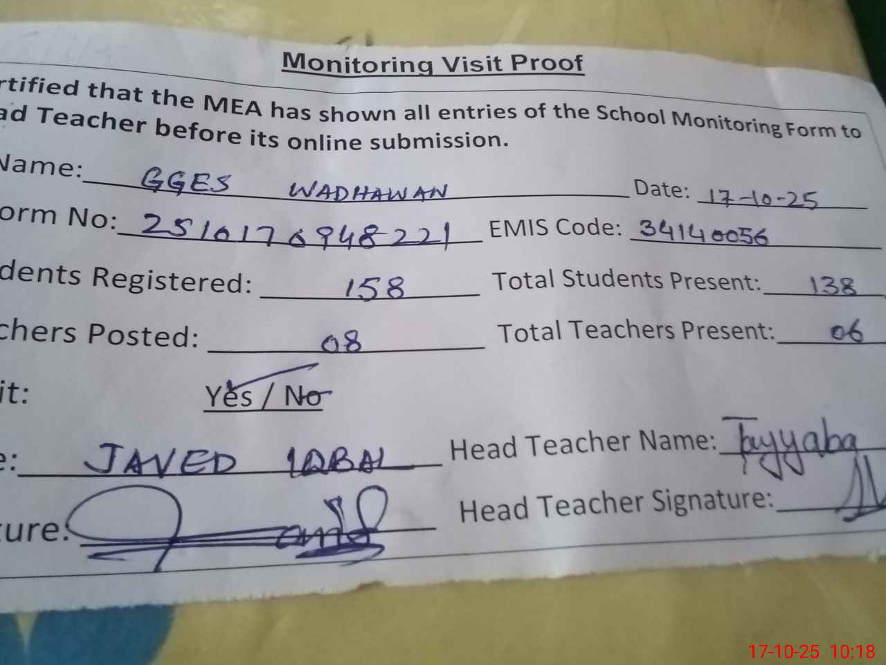 | Attendance Register | Head Teacher | MEA with School | Visit Proof |