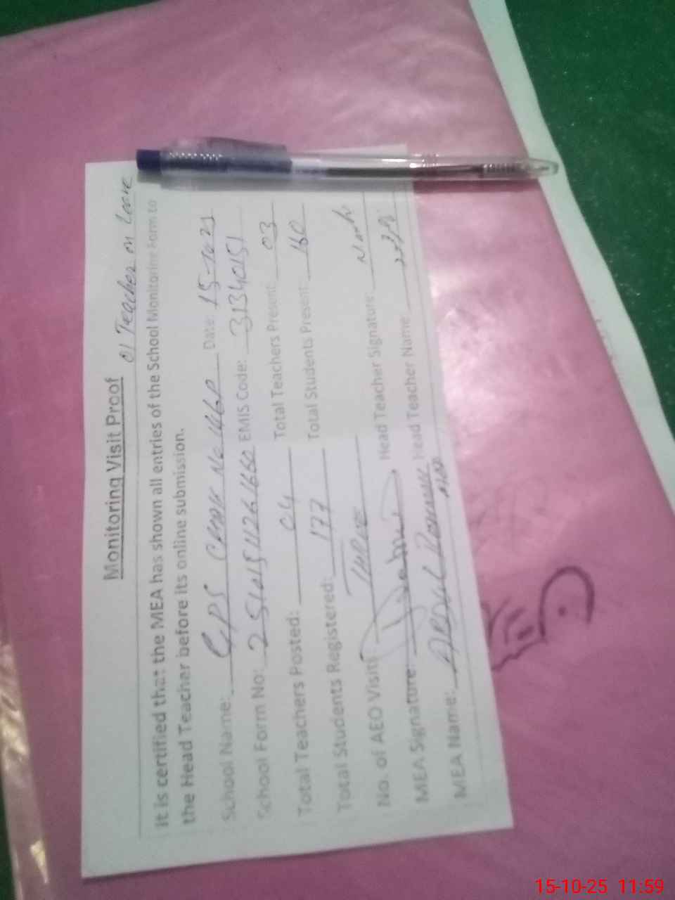 | Attendance Register | Head Teacher | MEA with School | Visit Proof |