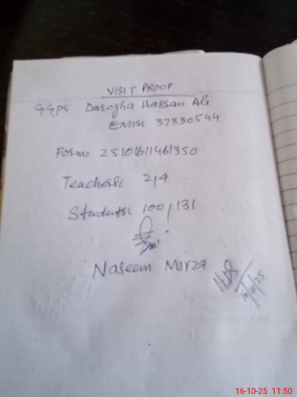 | Attendance Register | Head Teacher | MEA with School | Visit Proof |