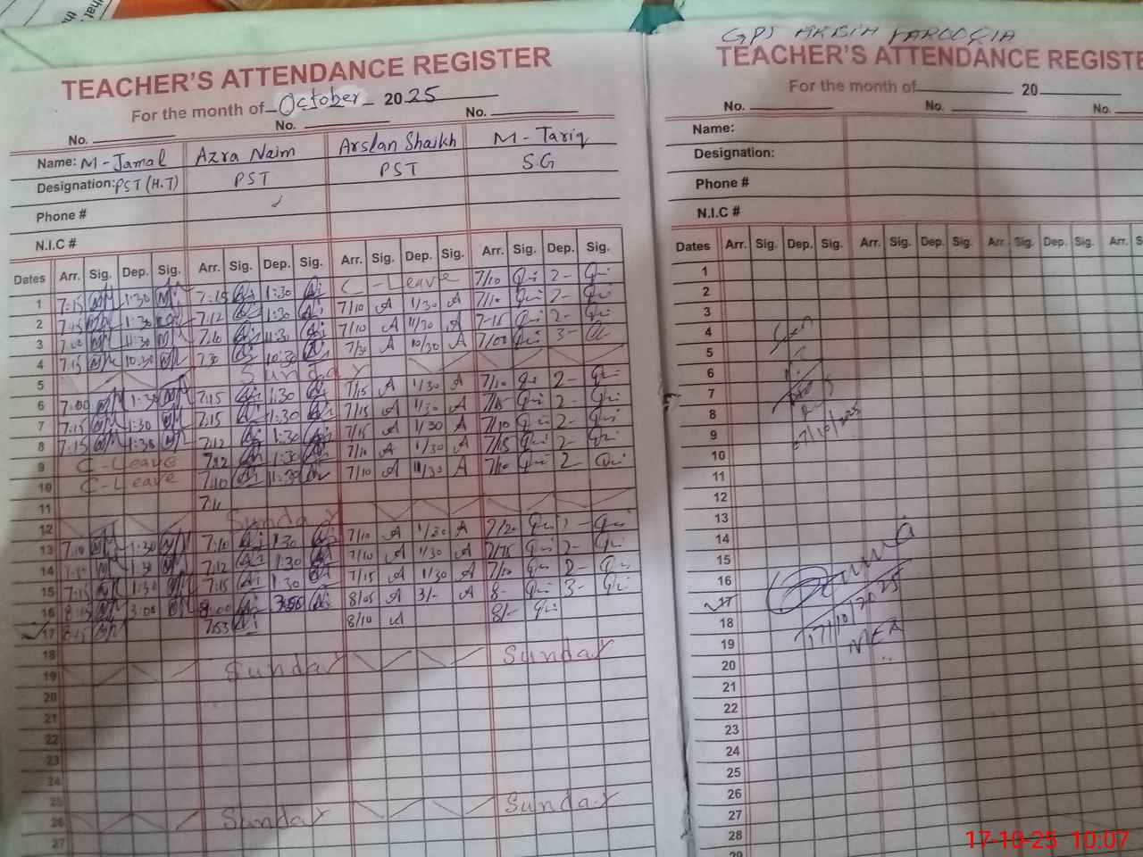 | CNIC | Full Name | Designation | R/C | Absence During Last Calender Month |