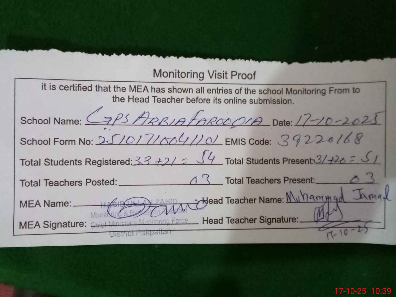 | Certified that this School was Inspected by the Undersigned MEA/DMO Today and the Information Stated Above is as Per Record. | |||||