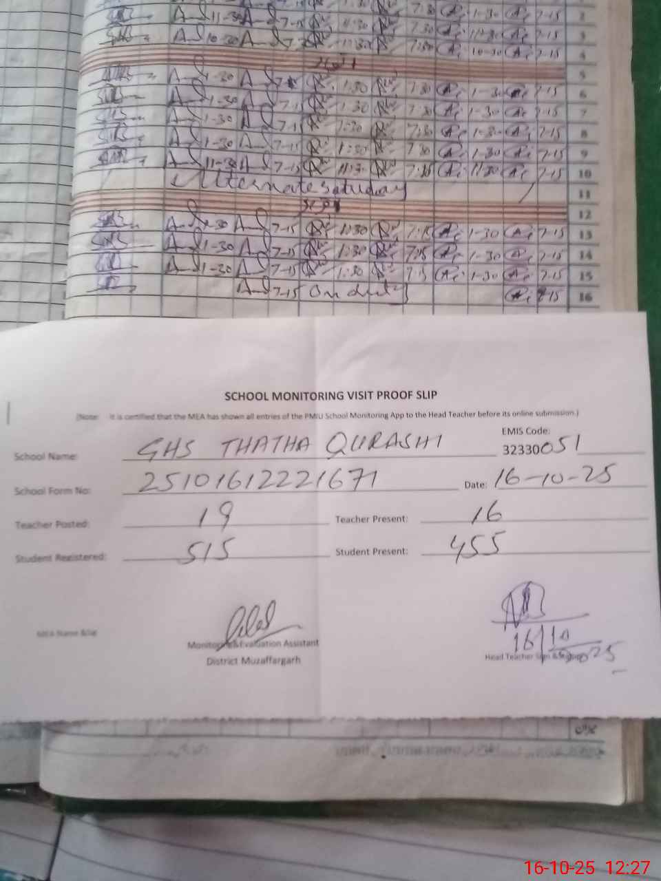 | Attendance Register | Head Teacher | MEA with School | Visit Proof |