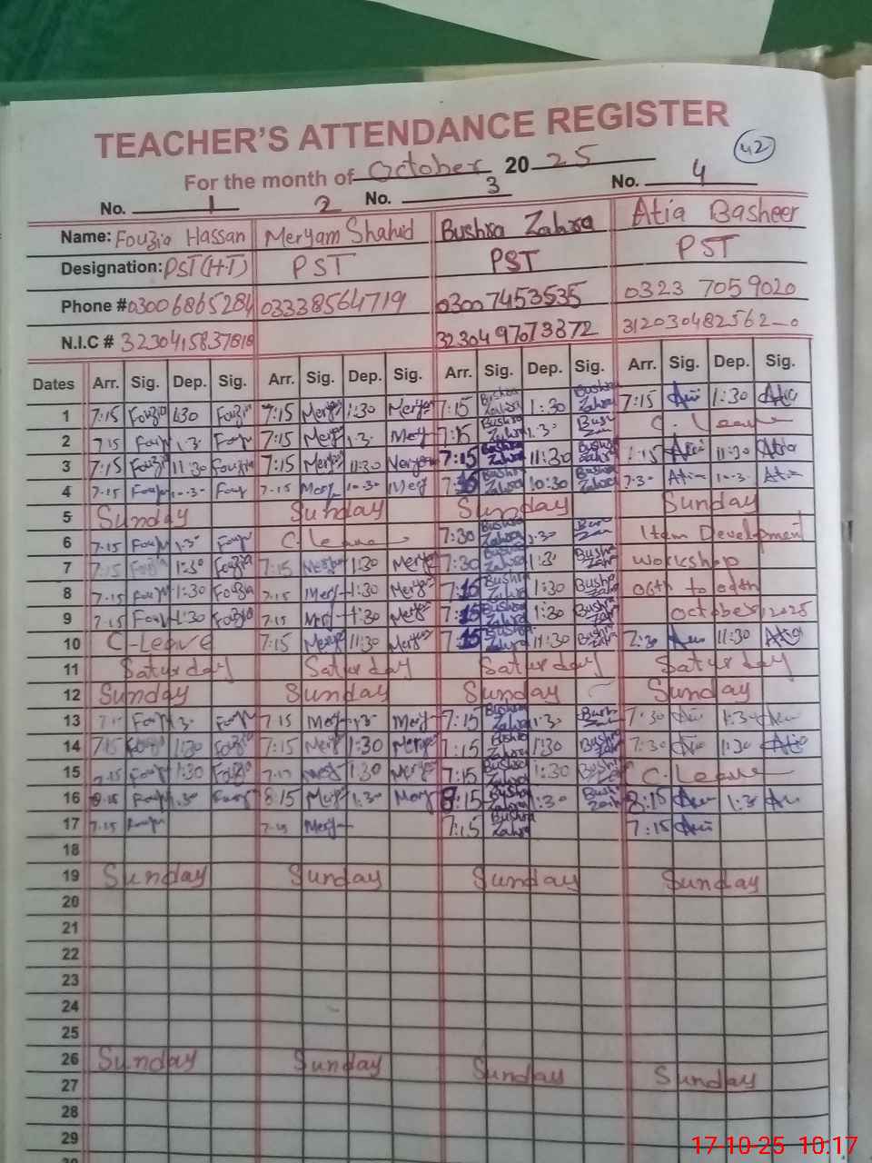 | CNIC | Full Name | Designation | R/C | Absence during last cal. month |