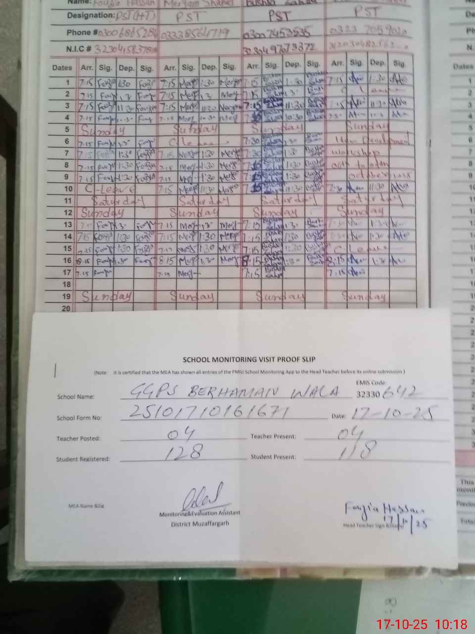 | Attendance Register | Head Teacher | MEA with School | Visit Proof |