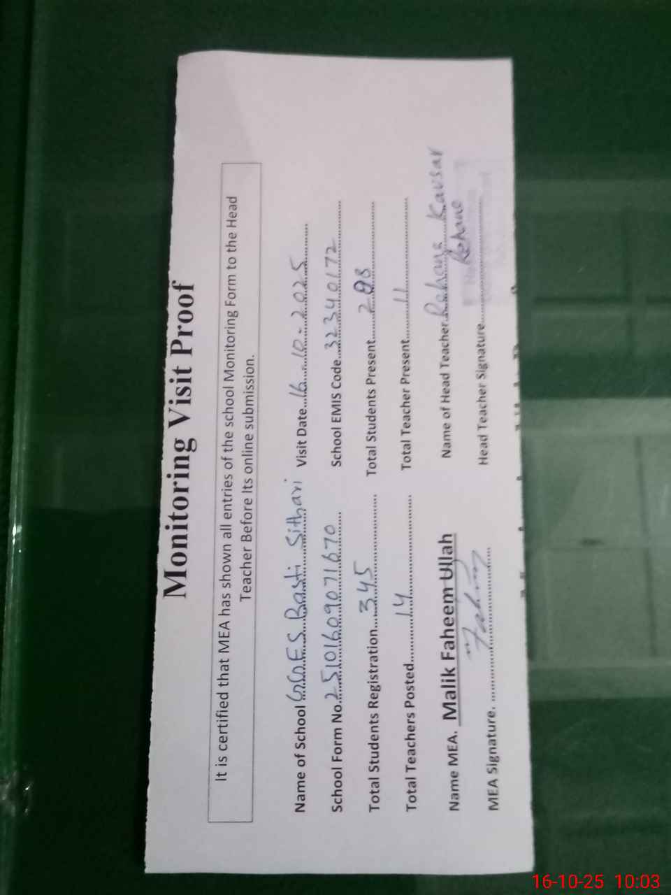 | Attendance Register | Head Teacher | MEA with School | Visit Proof |