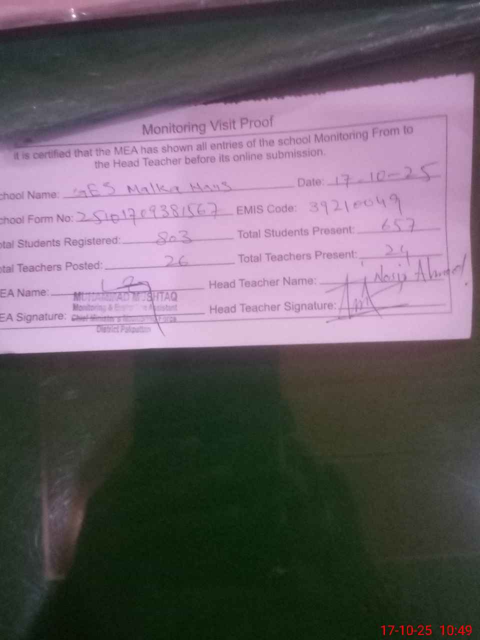 | Certified that this School was Inspected by the Undersigned MEA/DMO Today and the Information Stated Above is as Per Record. | |||||