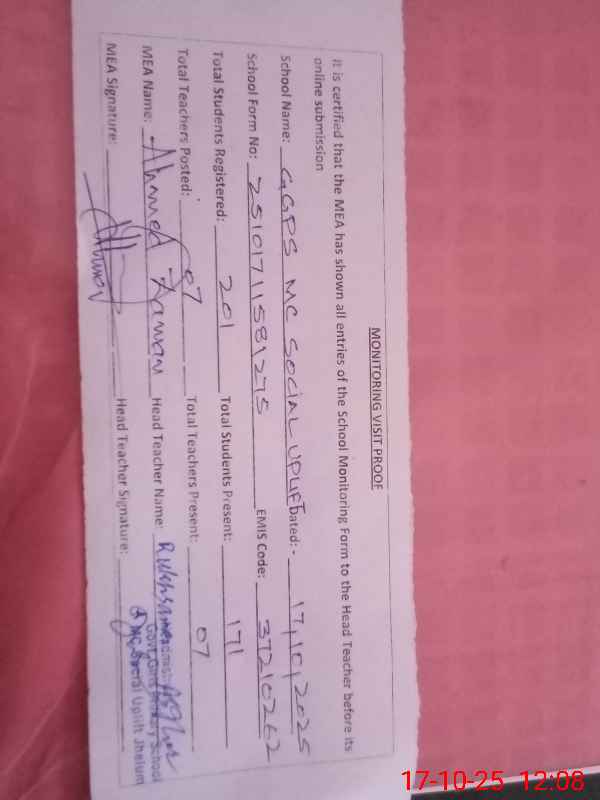 | EMIS Code: 37210262 | Name of School: GGPS MC SOCIAL UP LIFT JHELUM | |||