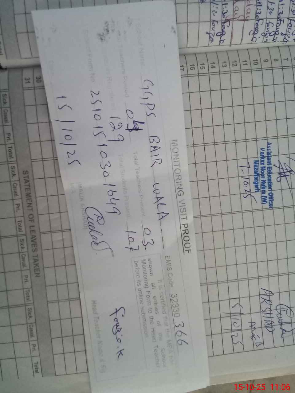| EMIS Code: 32330366 | Name of School: GGPS BAIR WALA | |||