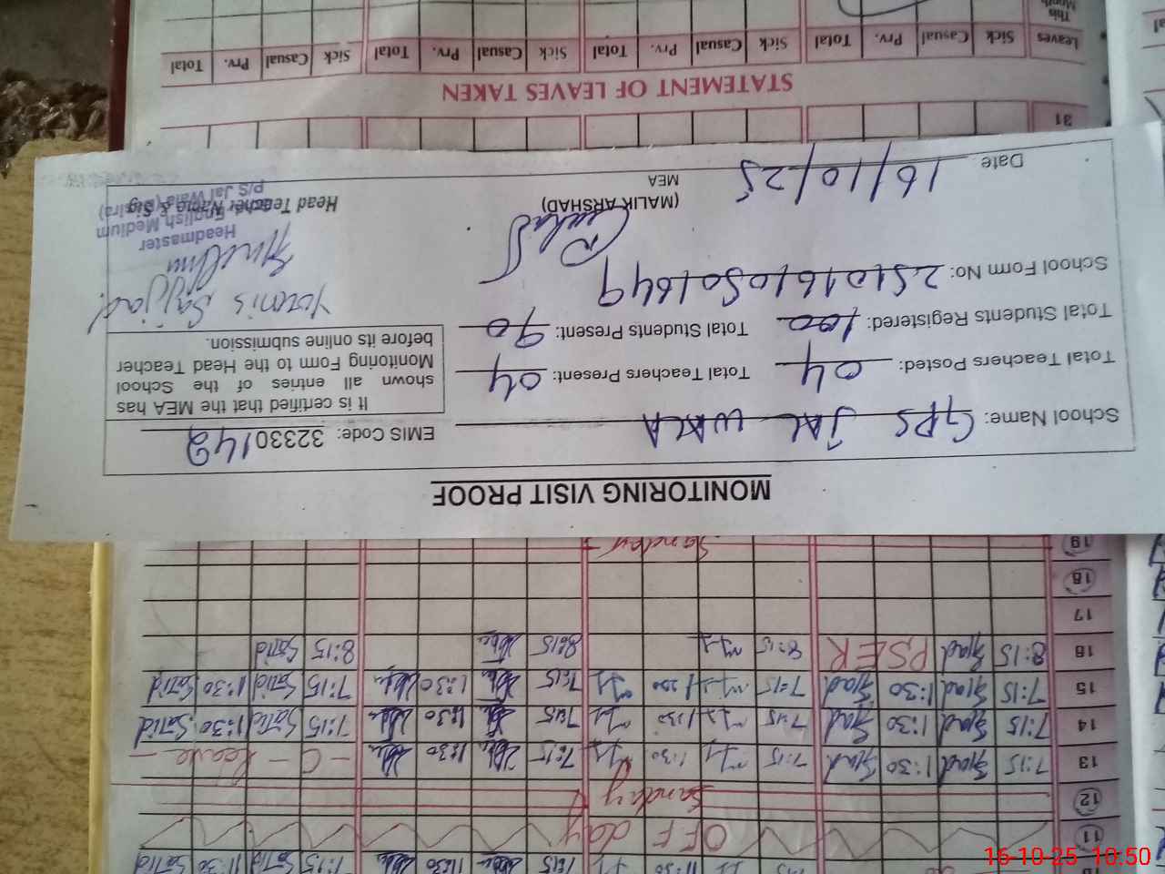 | Attendance Register | Head Teacher | MEA with School | Visit Proof |