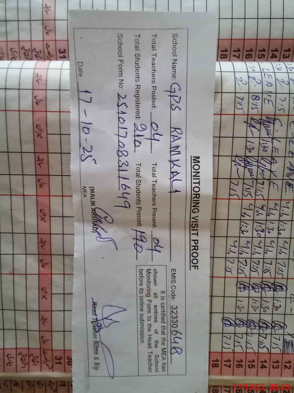 | Attendance Register | Head Teacher | MEA with School | Visit Proof |