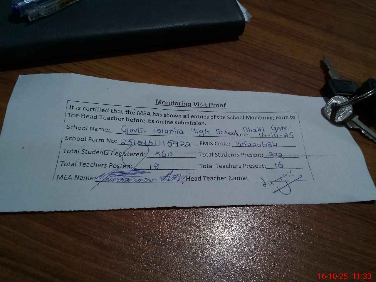 | EMIS Code: 35220684 | Name of School: GHS ISLAMIA BHATTI GATE | |||