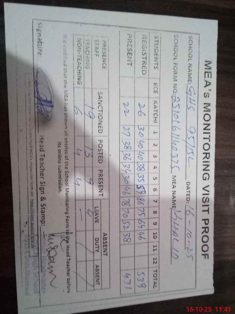 | Attendance Register | Head Teacher | MEA with School | Visit Proof |