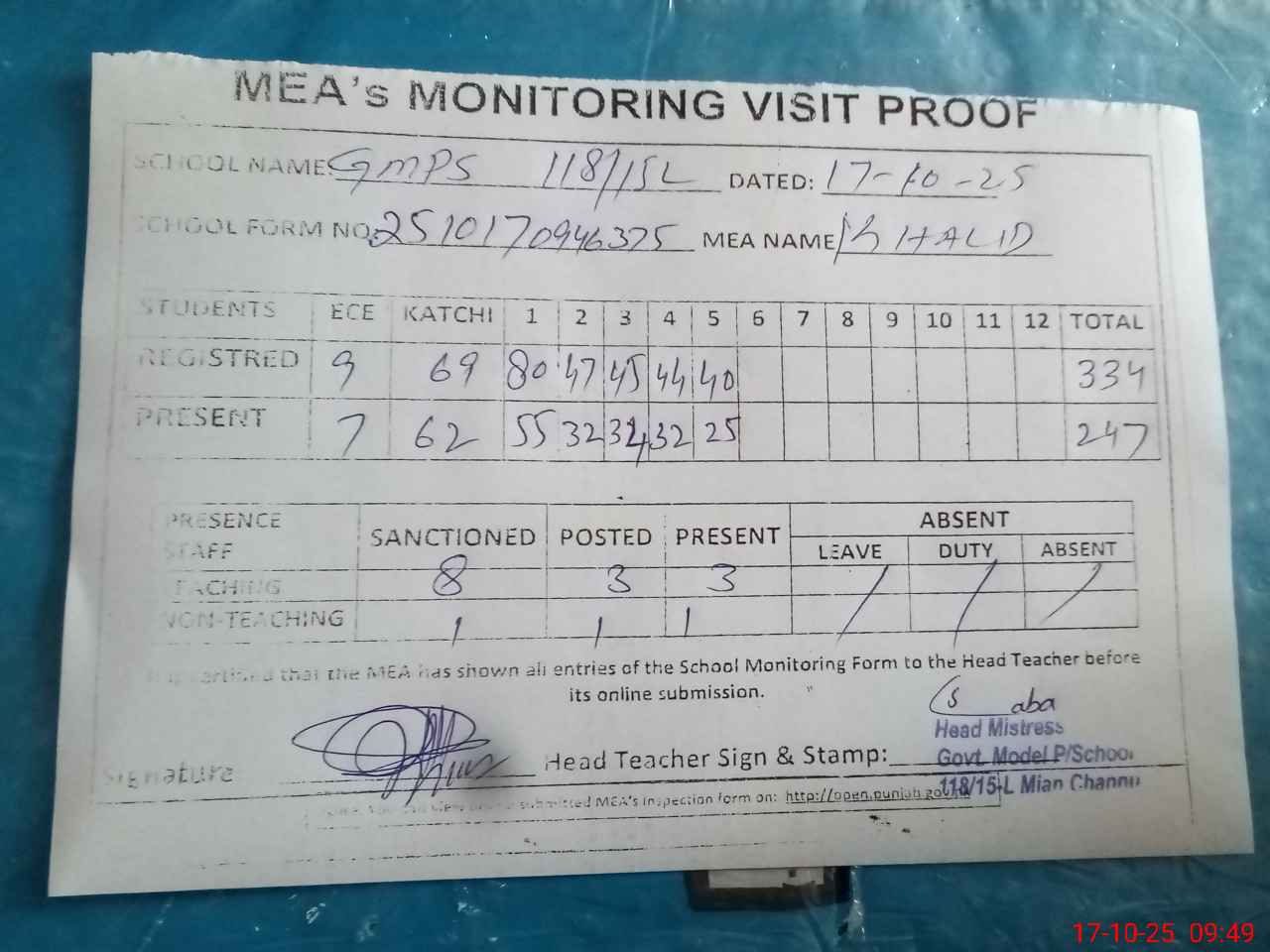 | EMIS Code: 36430334 | Name of School: GGMPS 118/15-L, MIAN CHANNU | |||