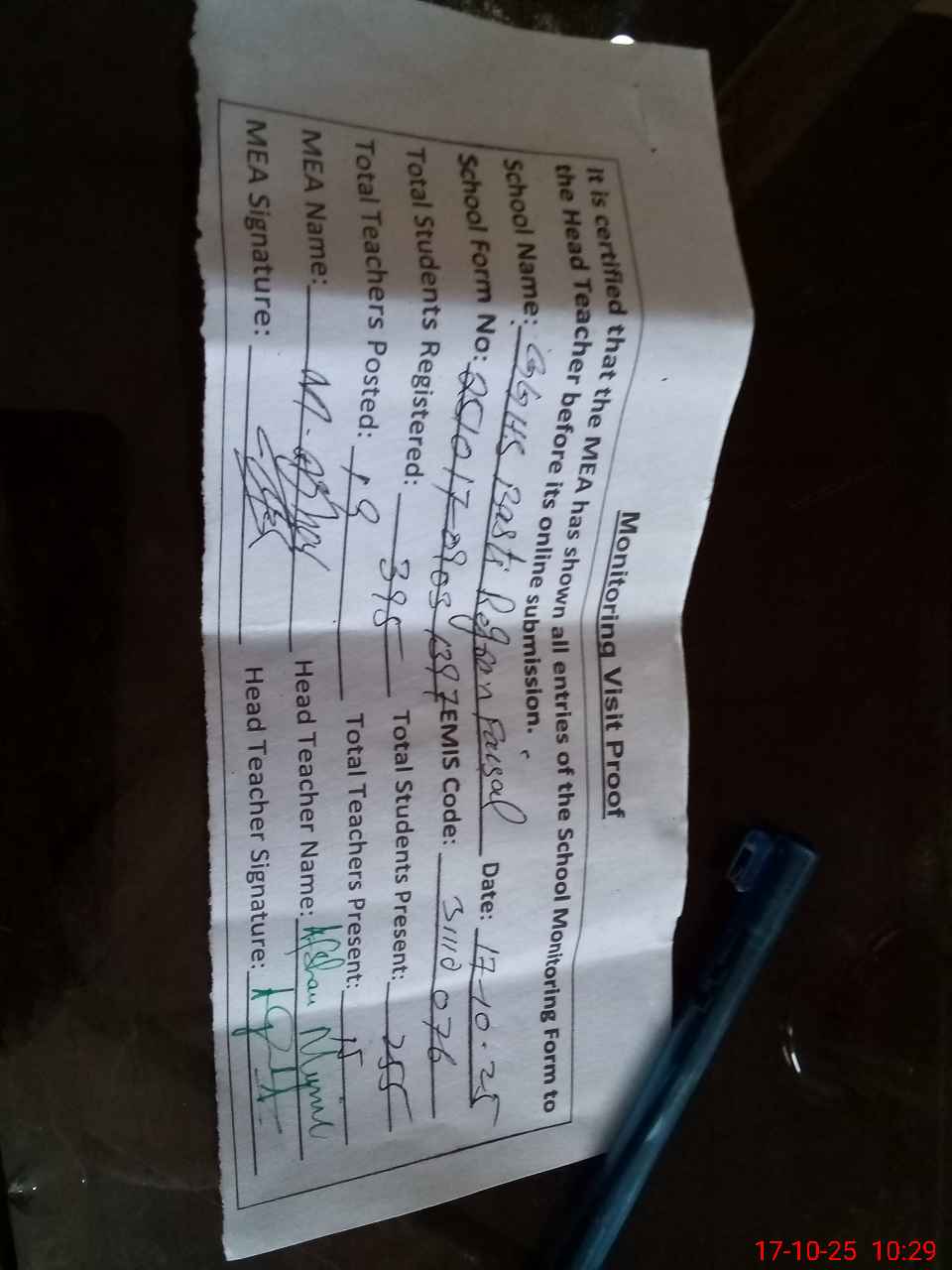 | Attendance Register | Head Teacher | MEA with School | Visit Proof |