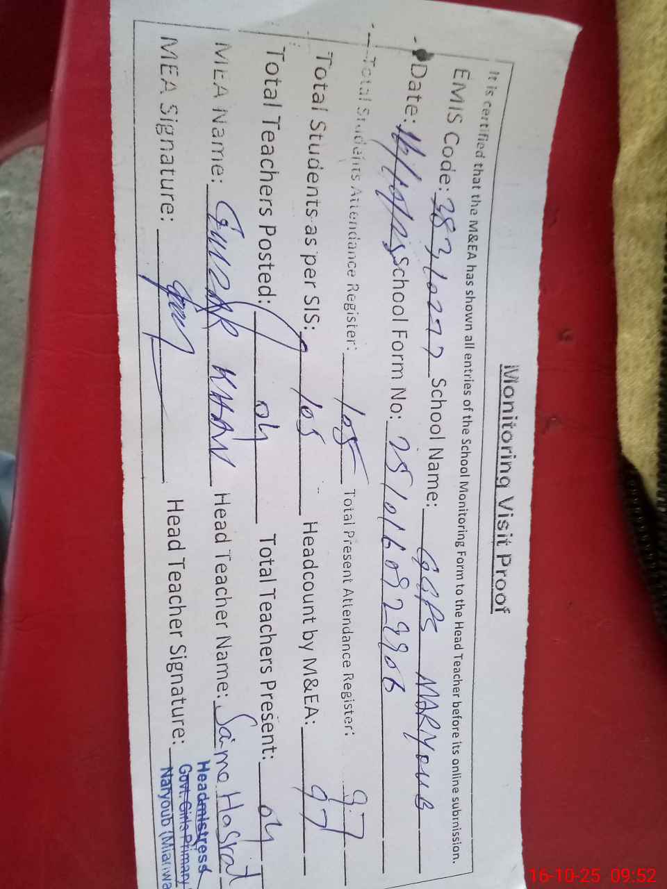 | Attendance Register | Head Teacher | MEA with School | Visit Proof |