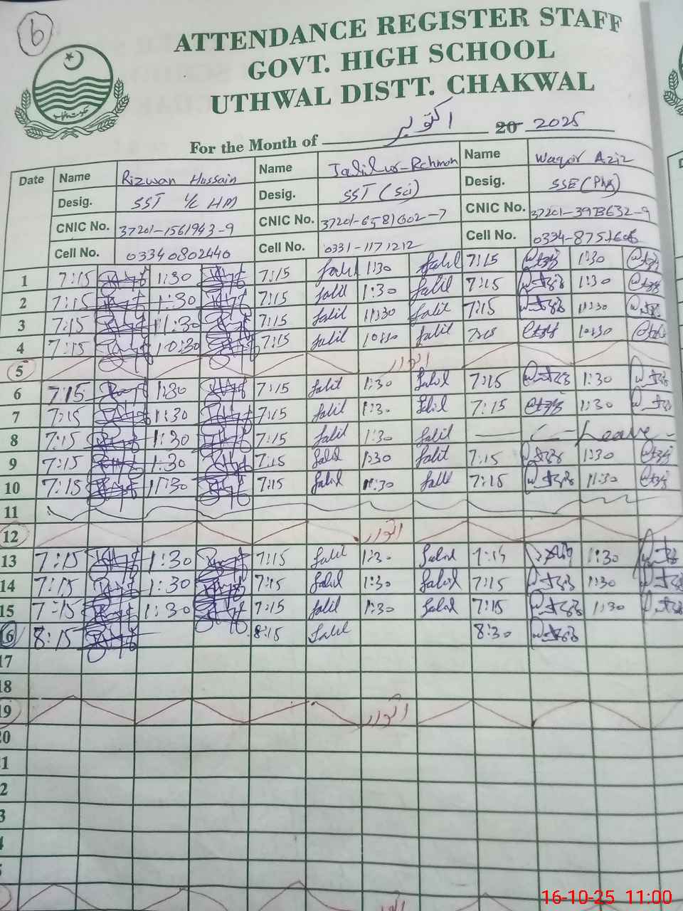 | CNIC | Full Name | Designation | R/C | Absence during last cal. month |
