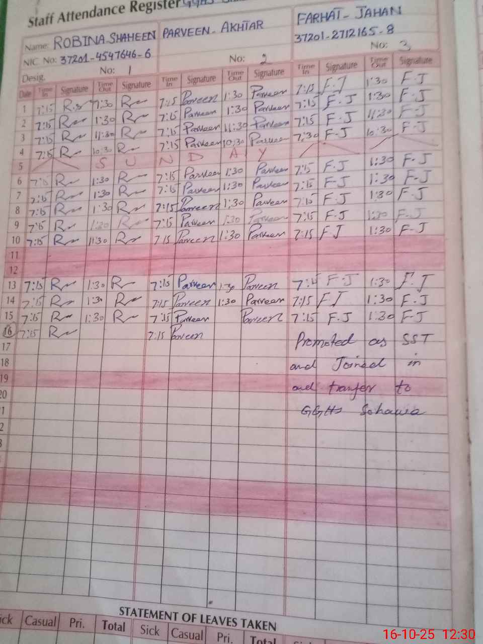 | CNIC | Full Name | Designation | R/C | Absence During Last Calender Month |
