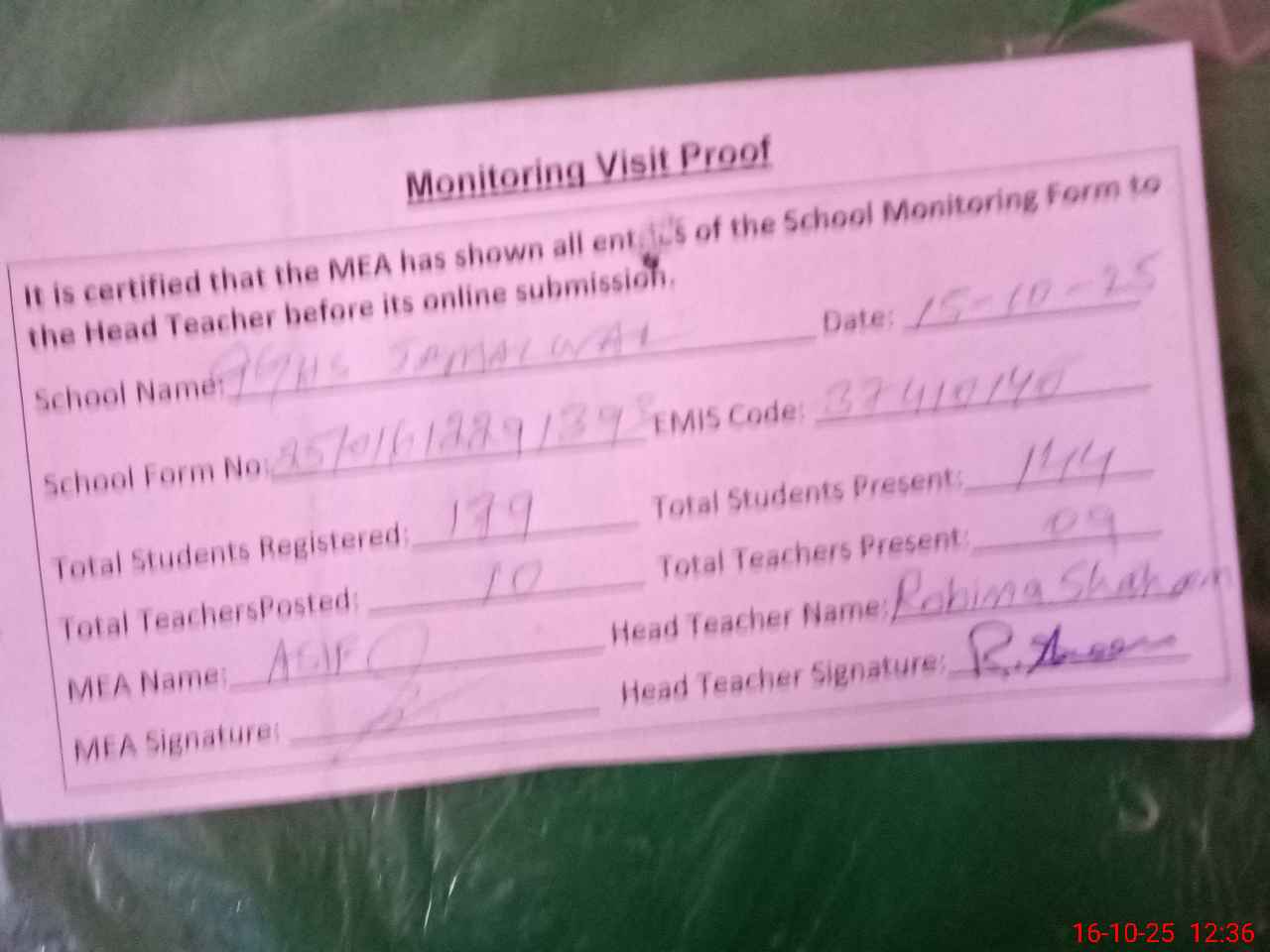 | Attendance Register | Head Teacher | MEA with School | Visit Proof |