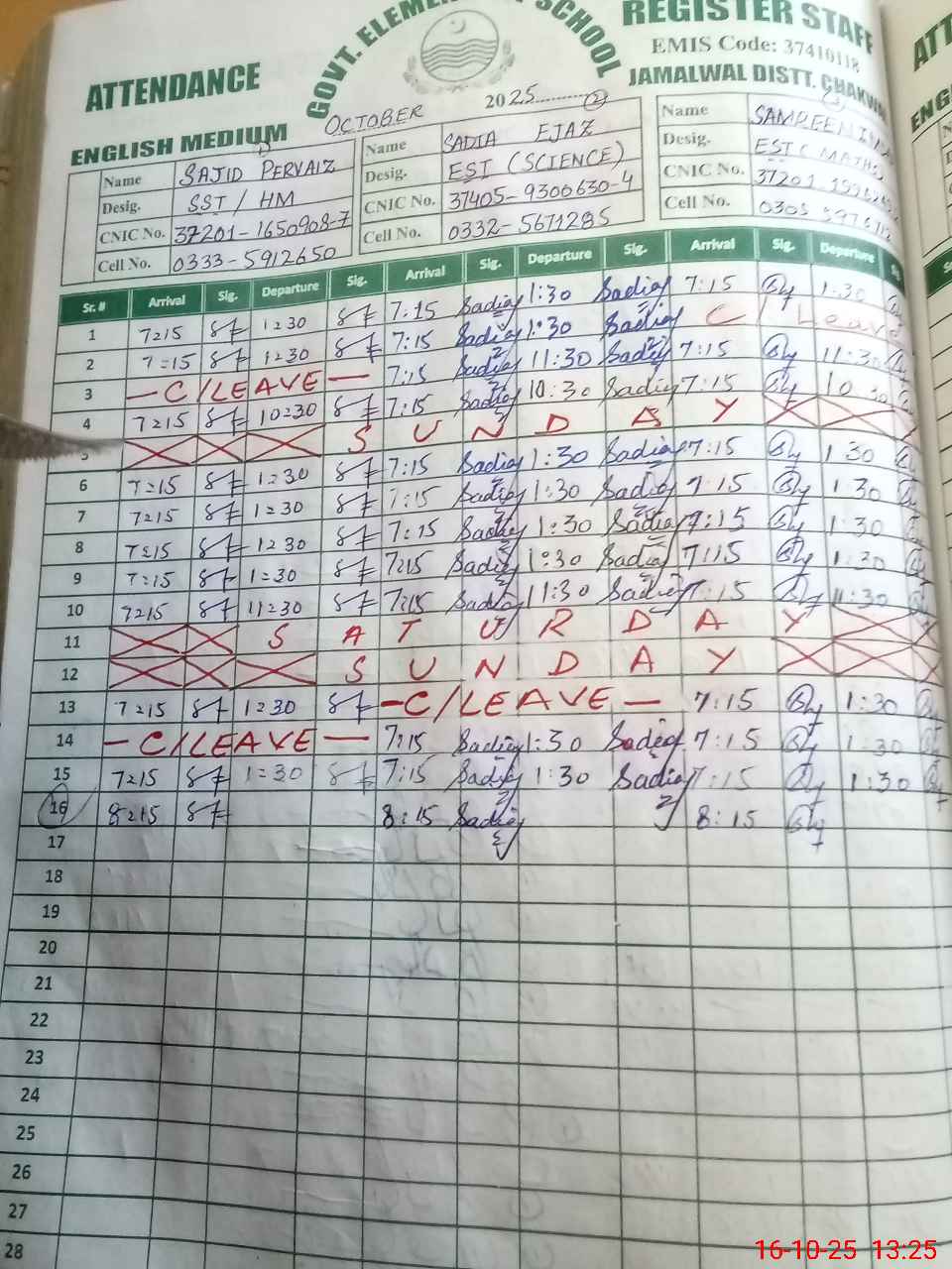 | CNIC | Full Name | Designation | R/C | Absence during last cal. month |