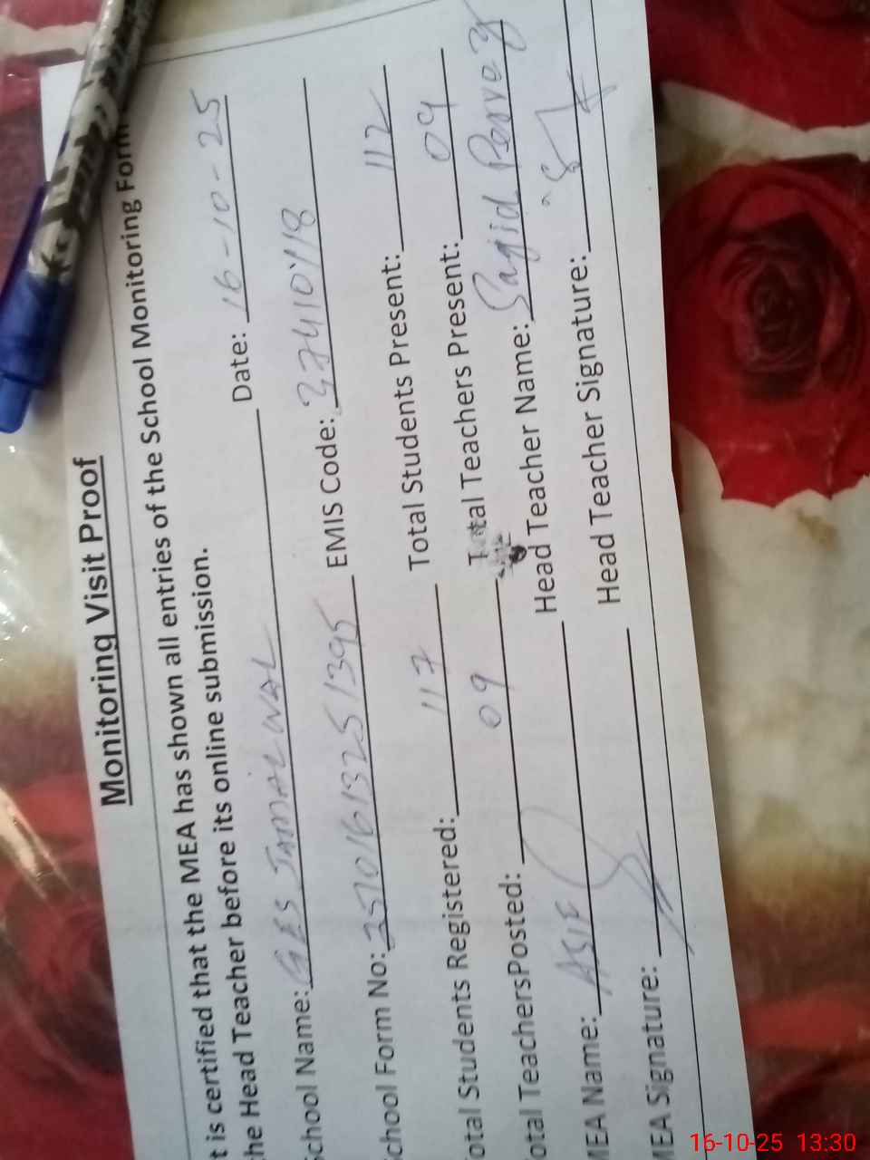 | Attendance Register | Head Teacher | MEA with School | Visit Proof |