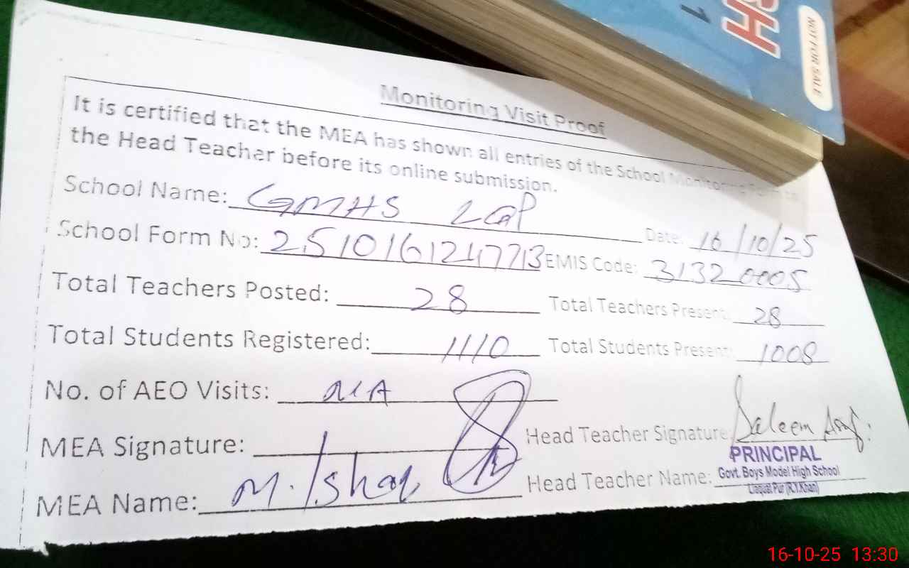| Certified that this School was Inspected by the Undersigned MEA/DMO Today and the Information Stated Above is as Per Record. | |||||