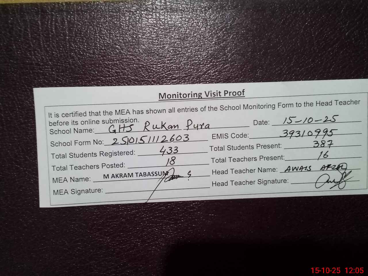 | Attendance Register | Head Teacher | MEA with School | Visit Proof |