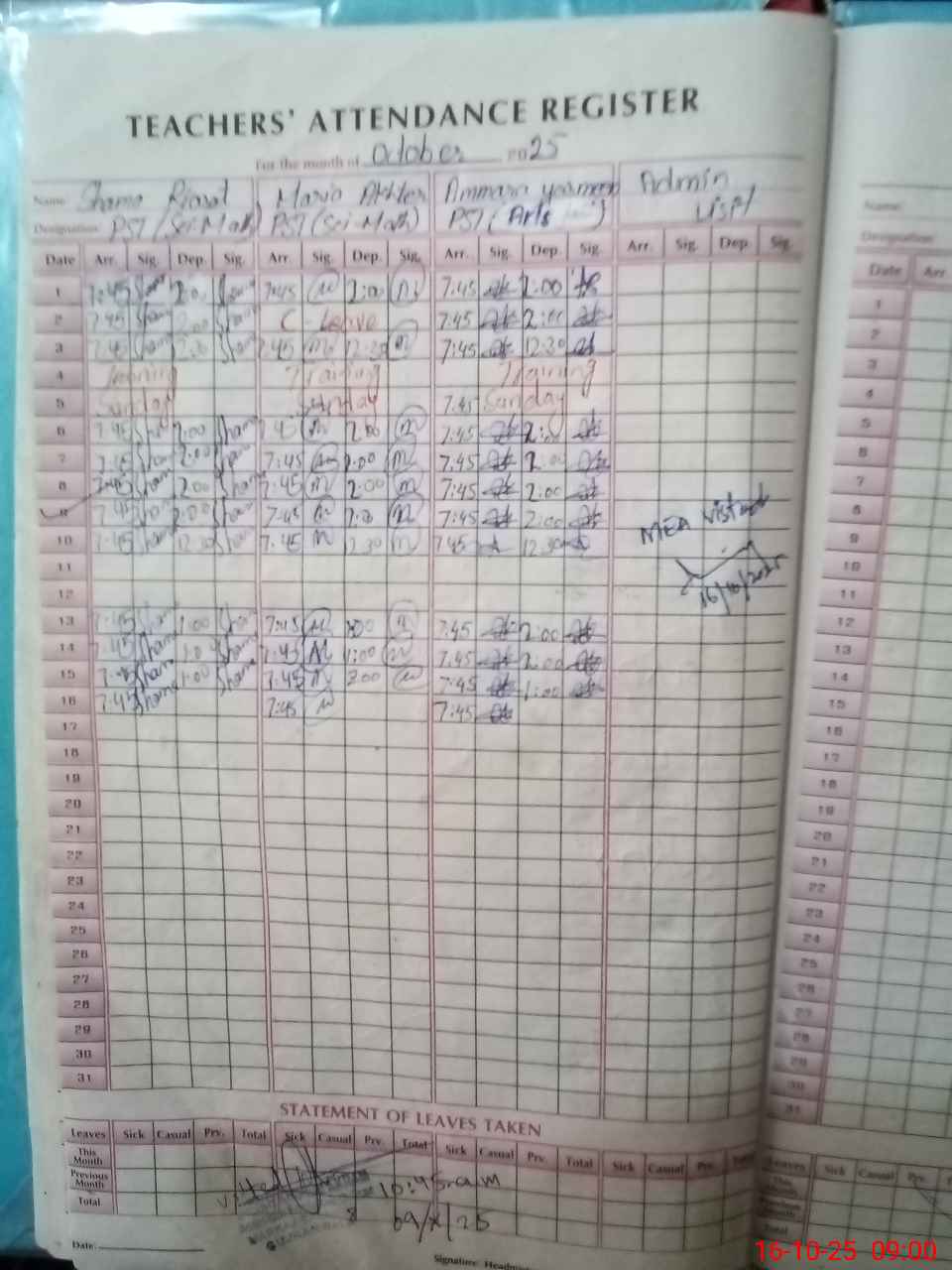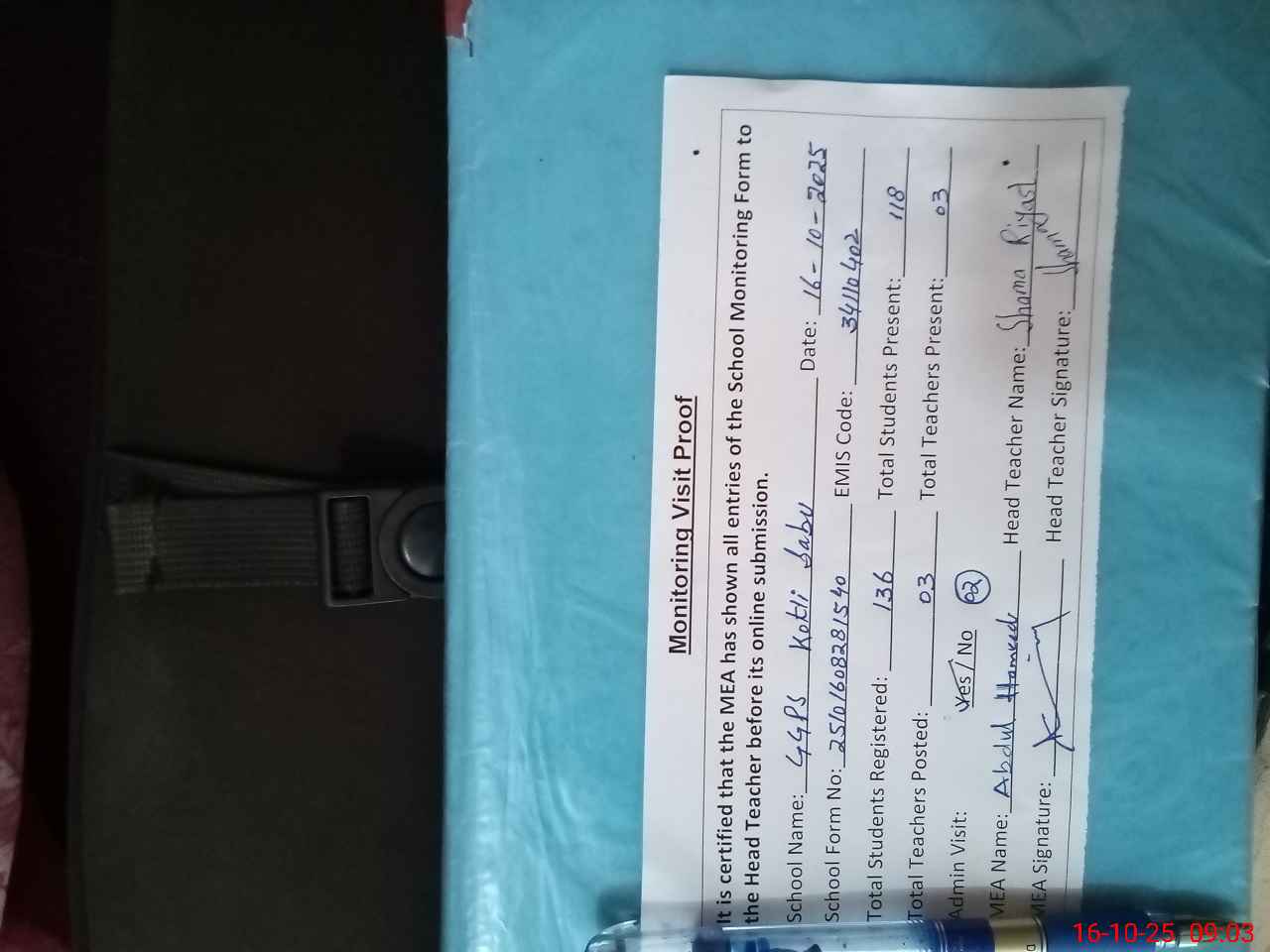 | Attendance Register | Head Teacher | MEA with School | Visit Proof |
