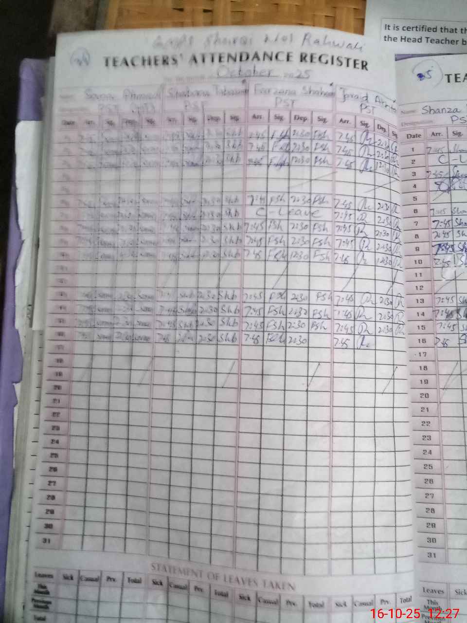 | CNIC | Full Name | Designation | R/C | Absence During Last Calender Month |