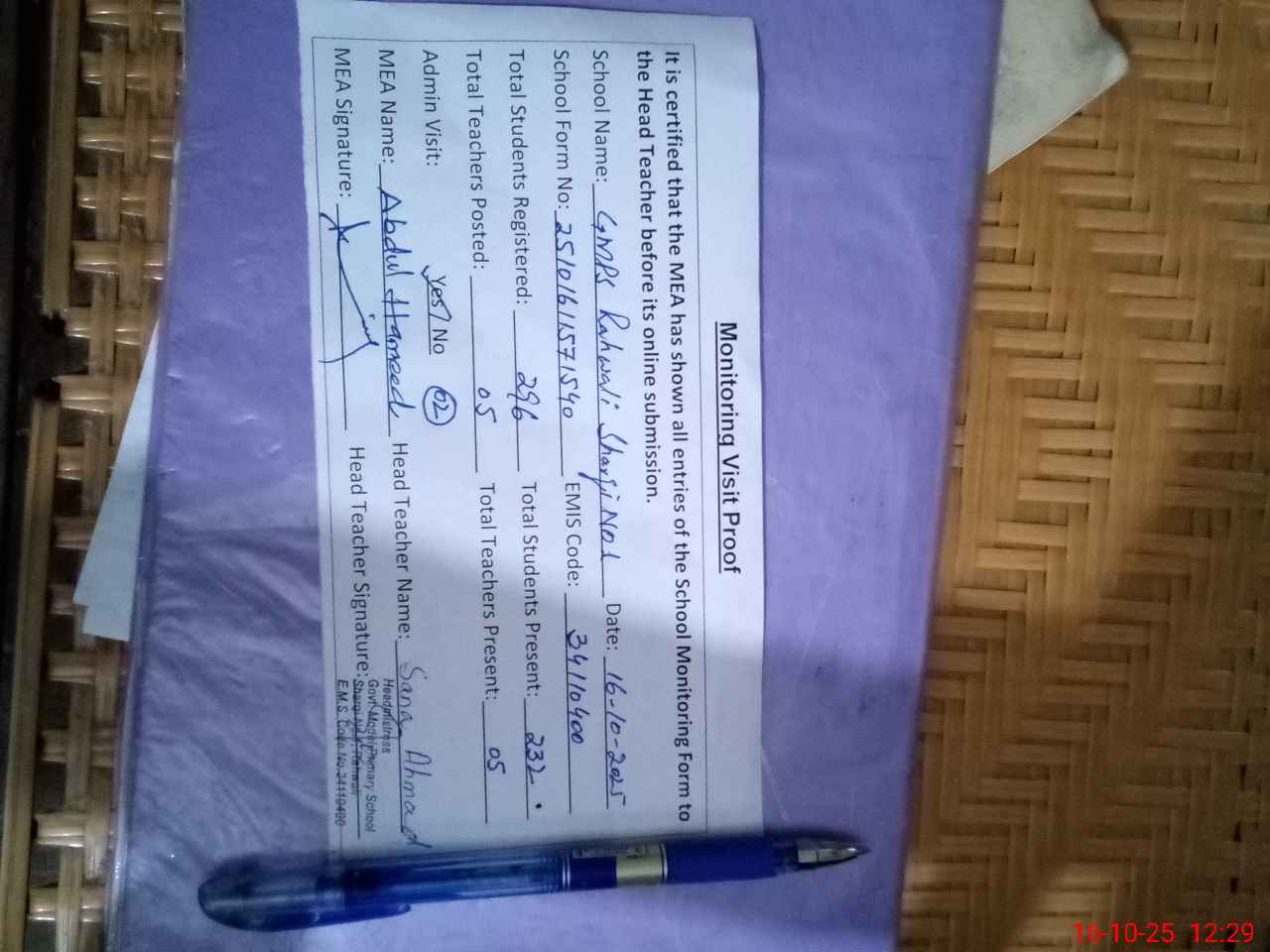 | Attendance Register | Head Teacher | MEA with School | Visit Proof |