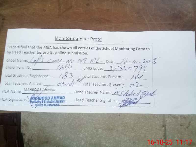 | Certified that this School was Inspected by the Undersigned MEA/DMO Today and the Information Stated Above is as Per Record. | |||||