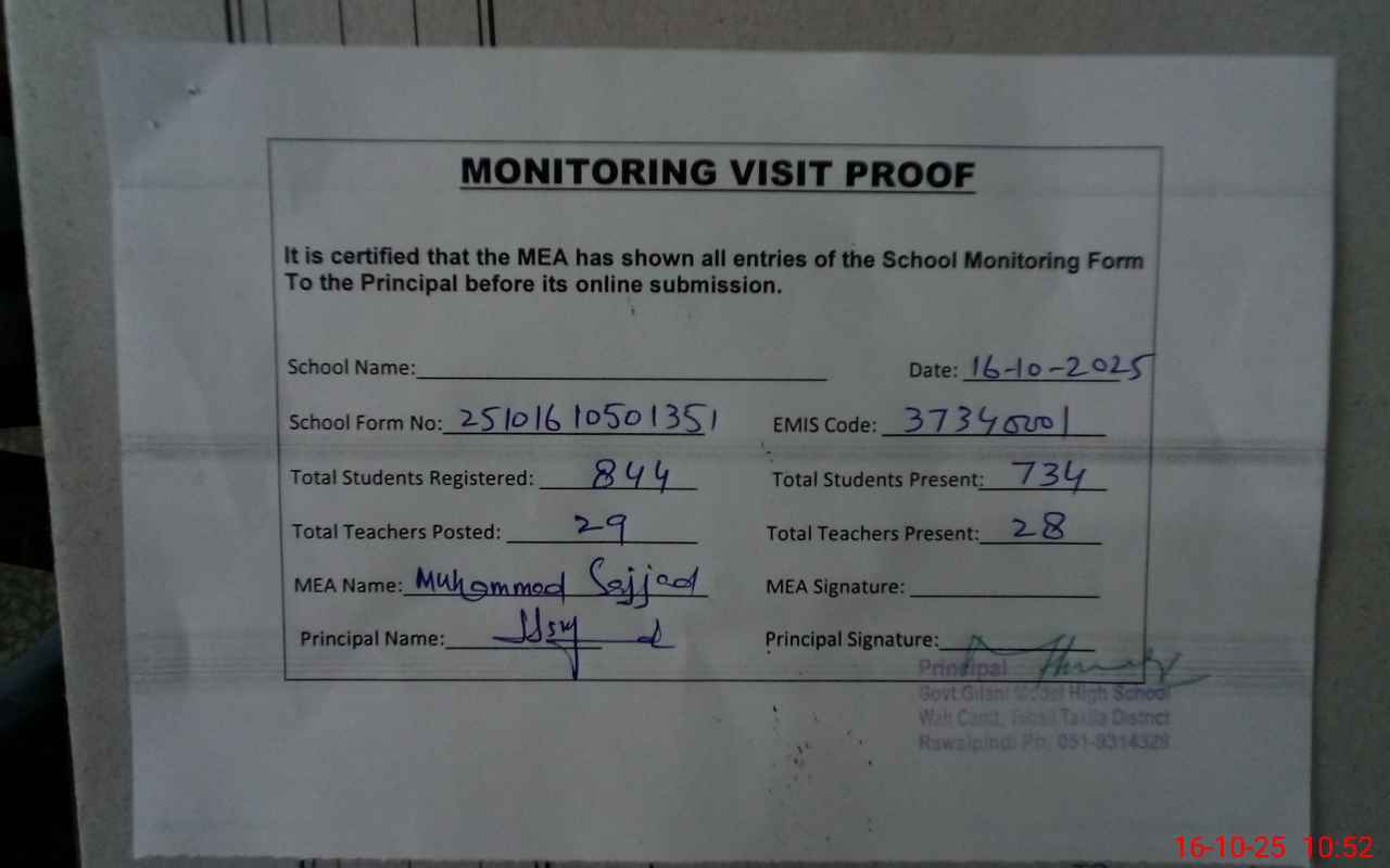| EMIS Code: 37340001 | Name of School: GHS GELLANI MODEL WAH CANTT | |||