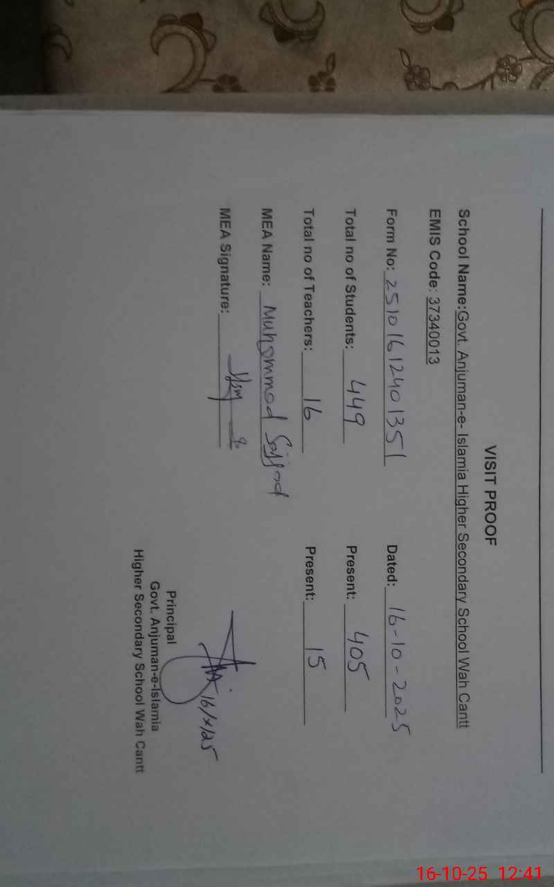 | EMIS Code: 37340013 | Name of School: GHSS ANJUMAN-E-ISLAM WAH CANTT | |||