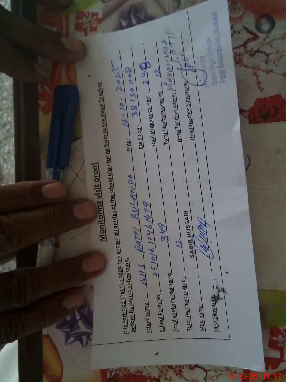 | Certified that this School was Inspected by the Undersigned MEA/DMO Today and the Information Stated Above is as Per Record. | |||||