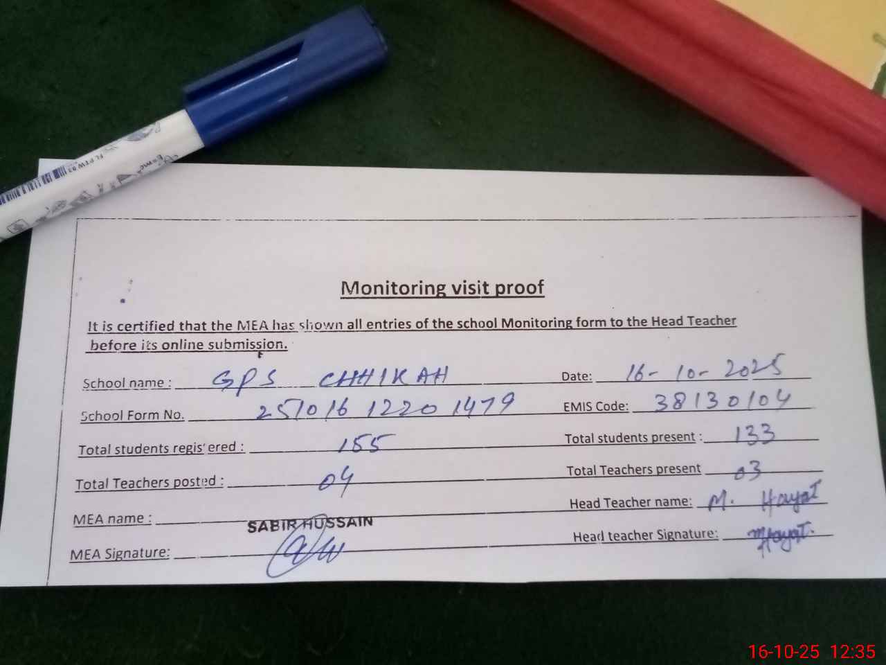| Attendance Register | Head Teacher | MEA with School | Visit Proof |