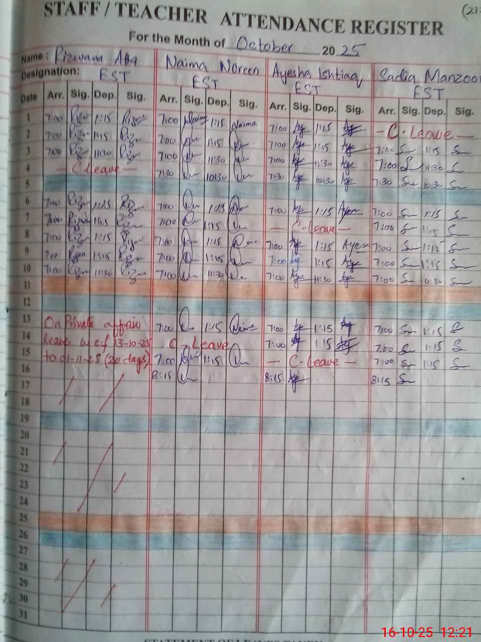 | CNIC | Full Name | Designation | R/C | Absence During Last Calender Month |