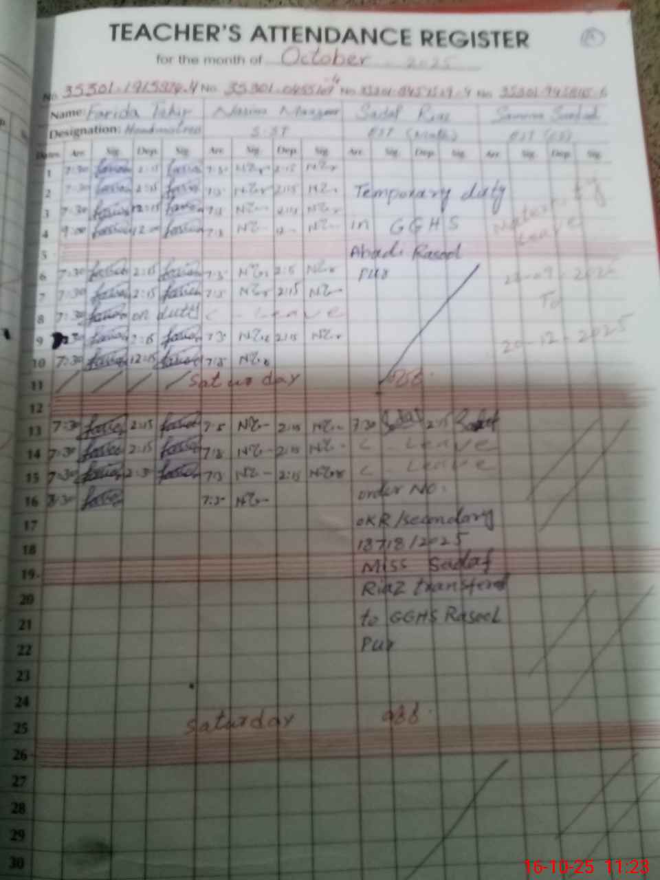 | CNIC | Full Name | Designation | R/C | Absence During Last Calender Month |