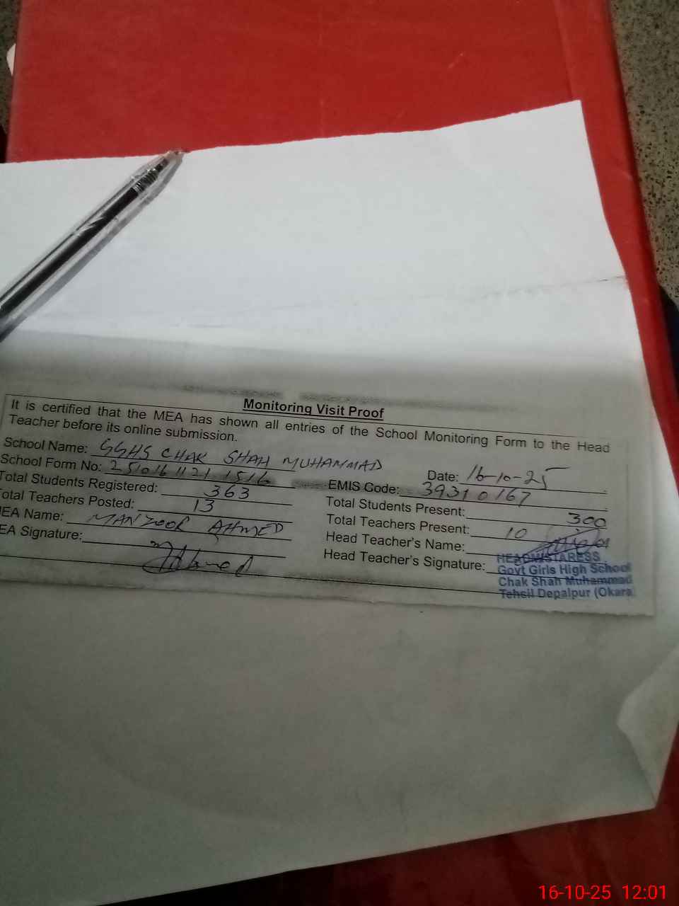 | Attendance Register | Head Teacher | MEA with School | Visit Proof |