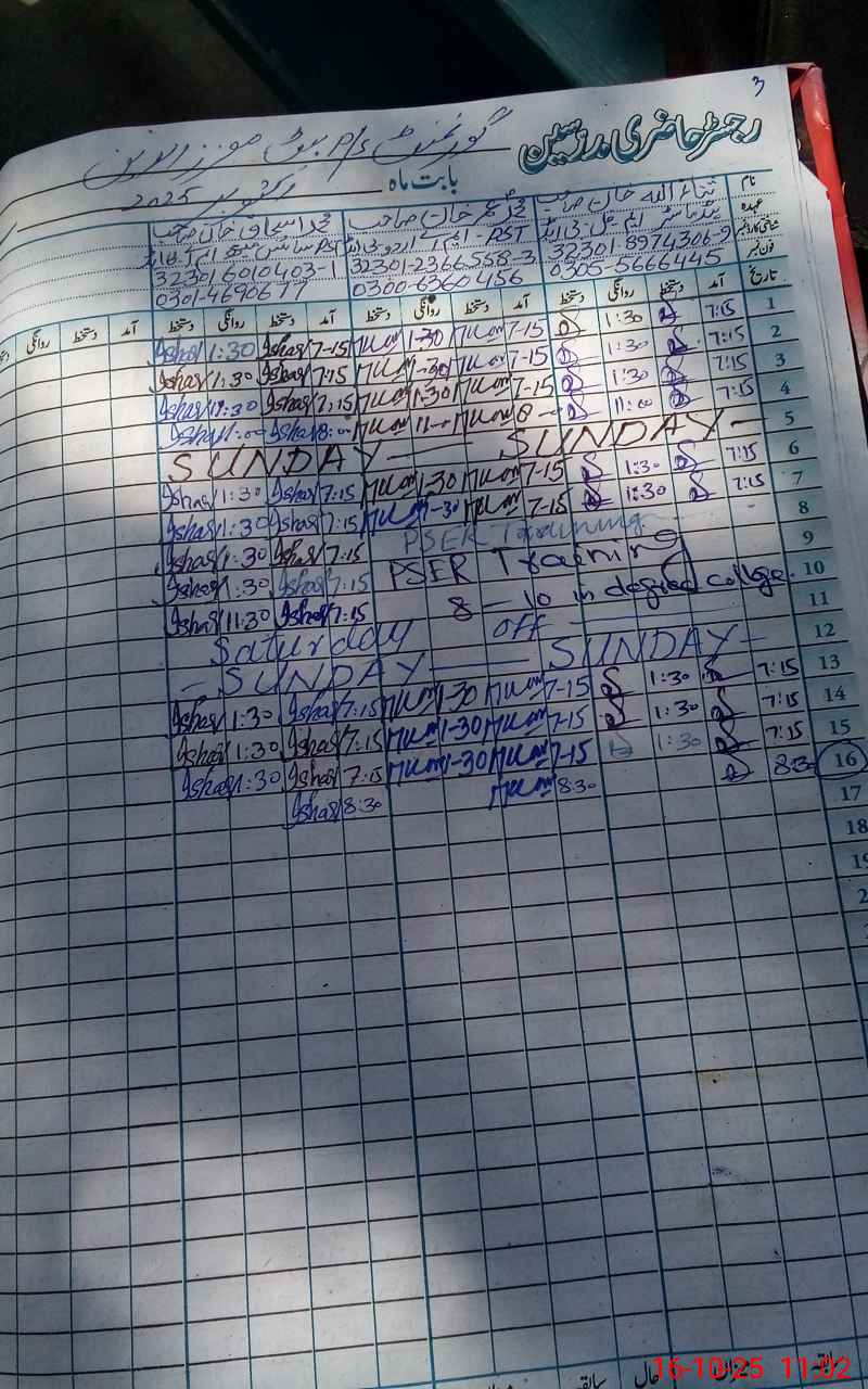 | CNIC | Full Name | Designation | R/C | Absence During Last Calender Month |