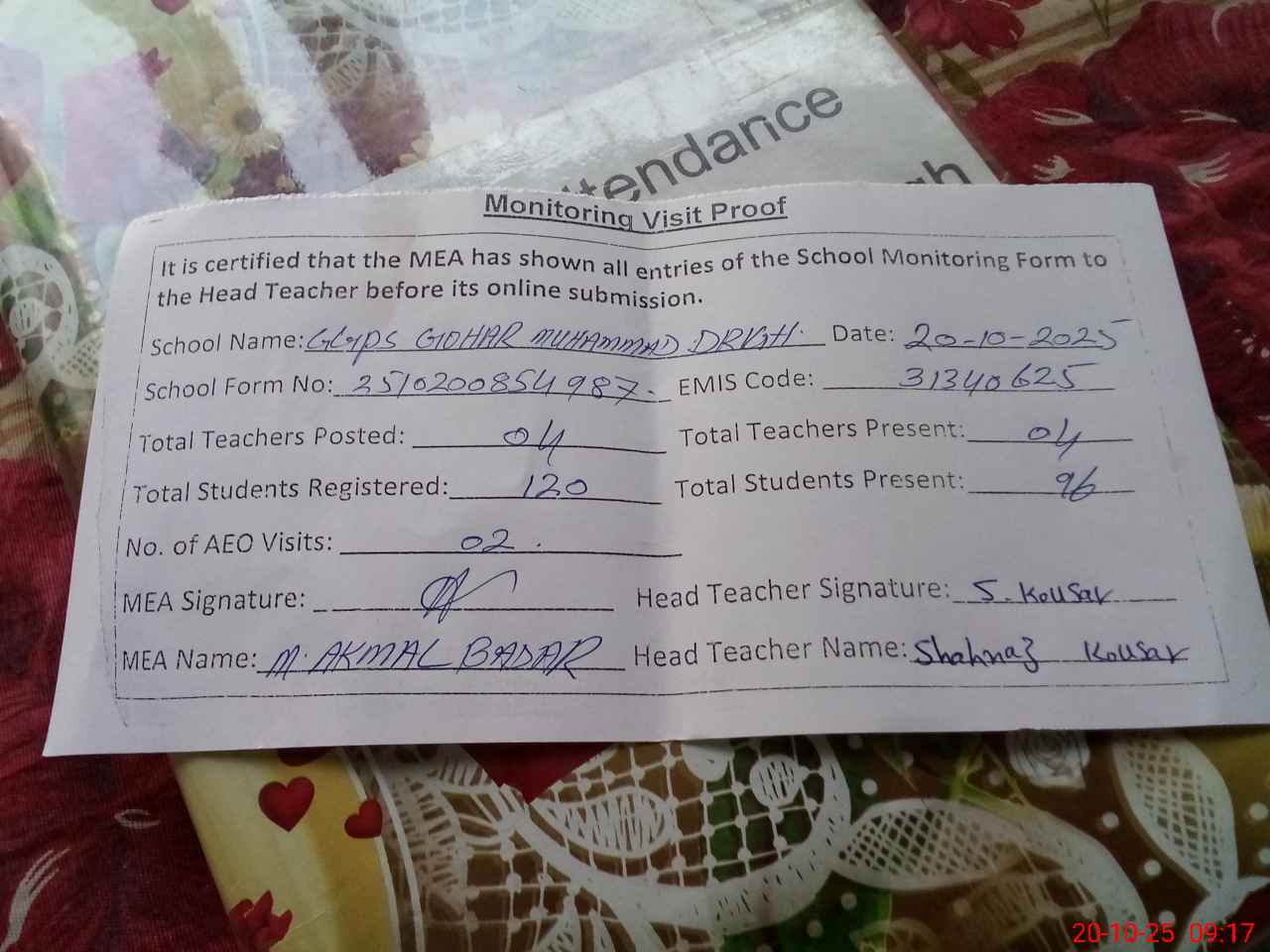 | Attendance Register | Head Teacher | MEA with School | Visit Proof |
