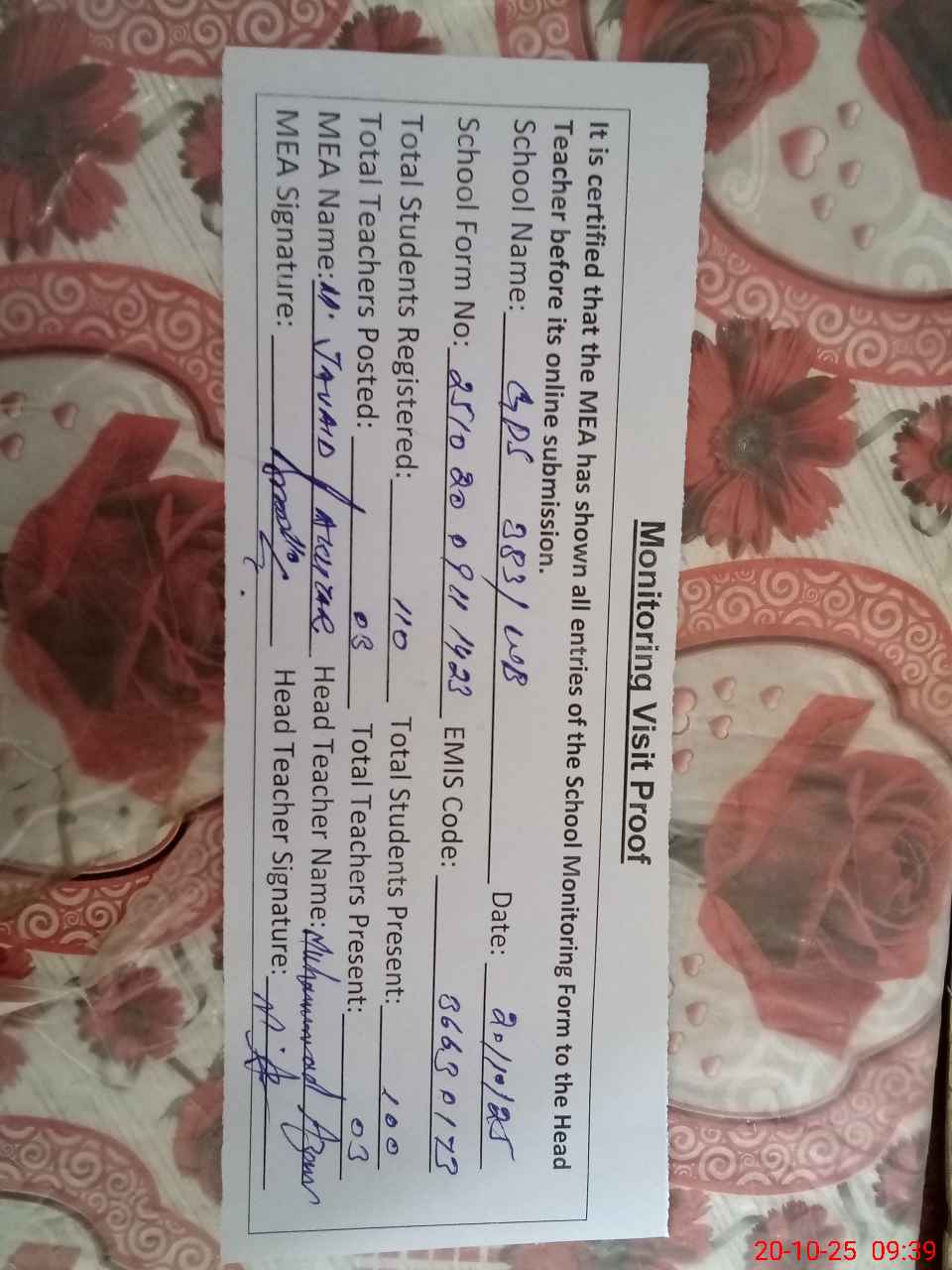| Attendance Register | Head Teacher | MEA with School | Visit Proof |