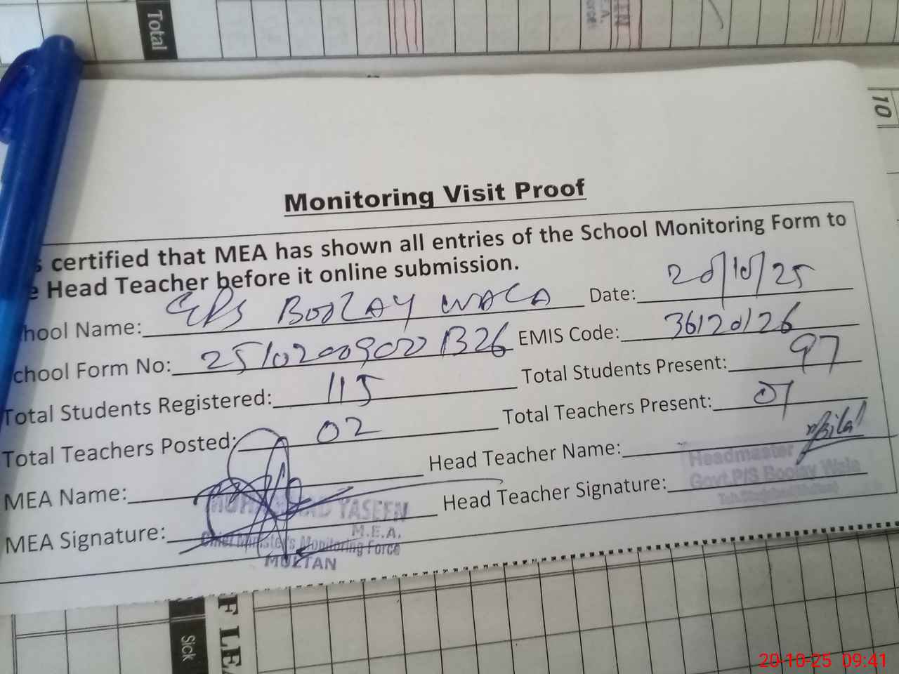 | Attendance Register | Head Teacher | MEA with School | Visit Proof |