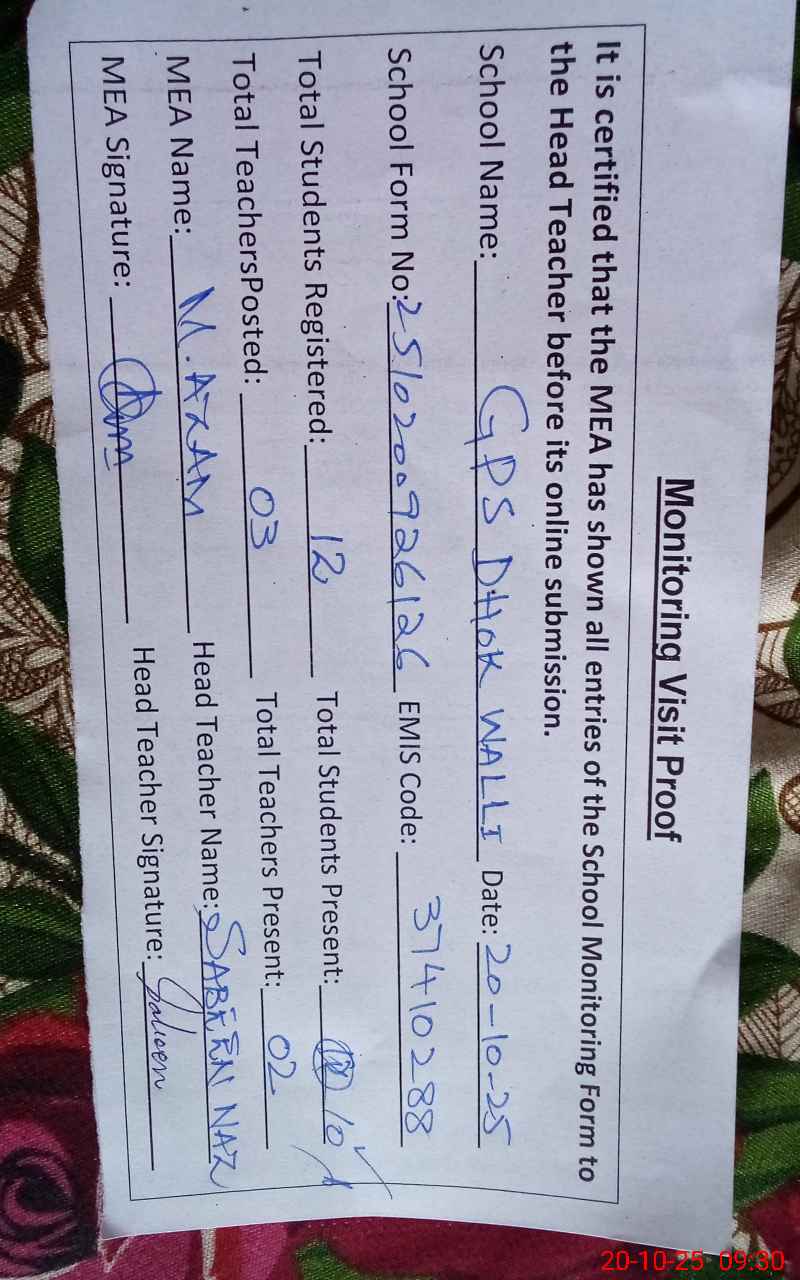 | EMIS Code: 37410288 | Name of School: GPS DHOK WALLI | |||
