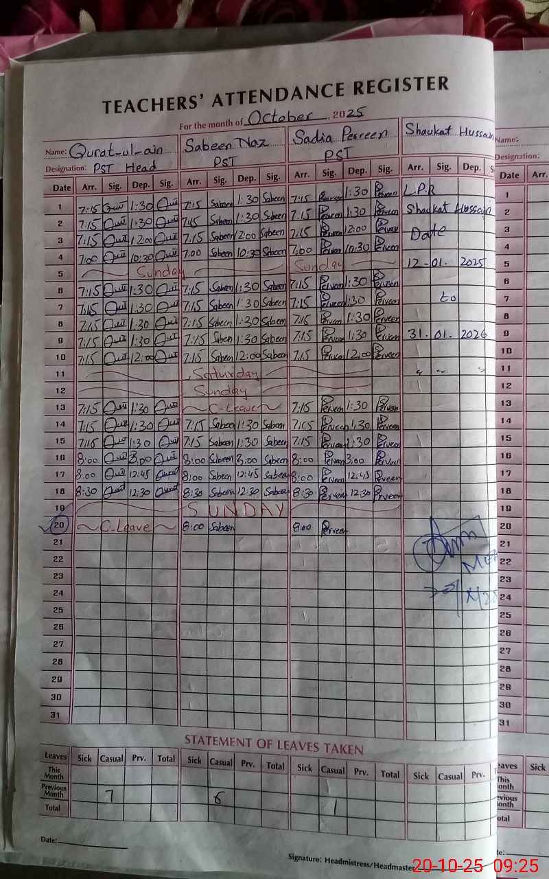 | Remarks (Use Separate Page if Required): Teacher Quart Ul Ain PST found unauthorized absent without any sanctioned leave proof during monitoring visit | |||||