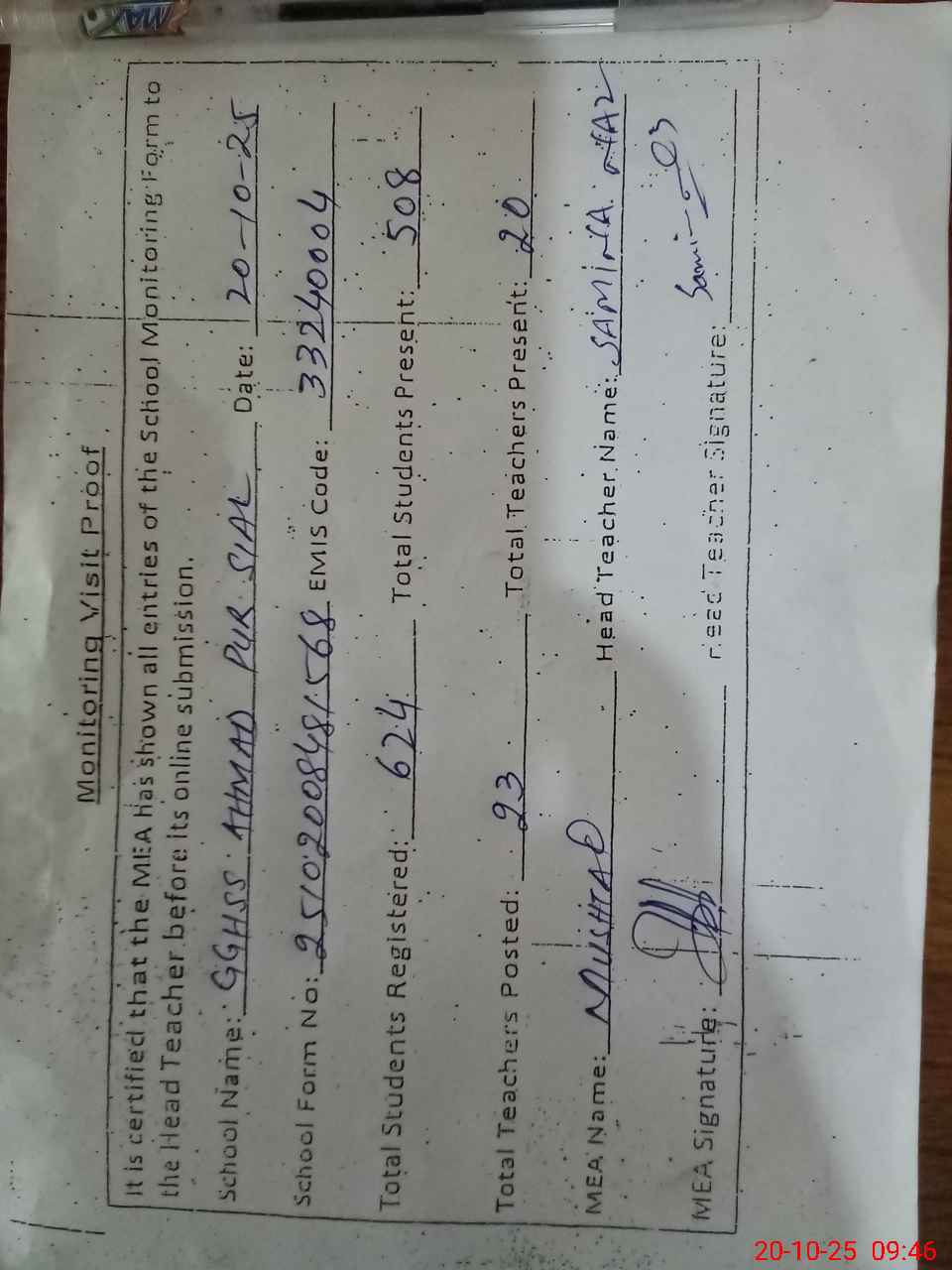 | Attendance Register | Head Teacher | MEA with School | Visit Proof |