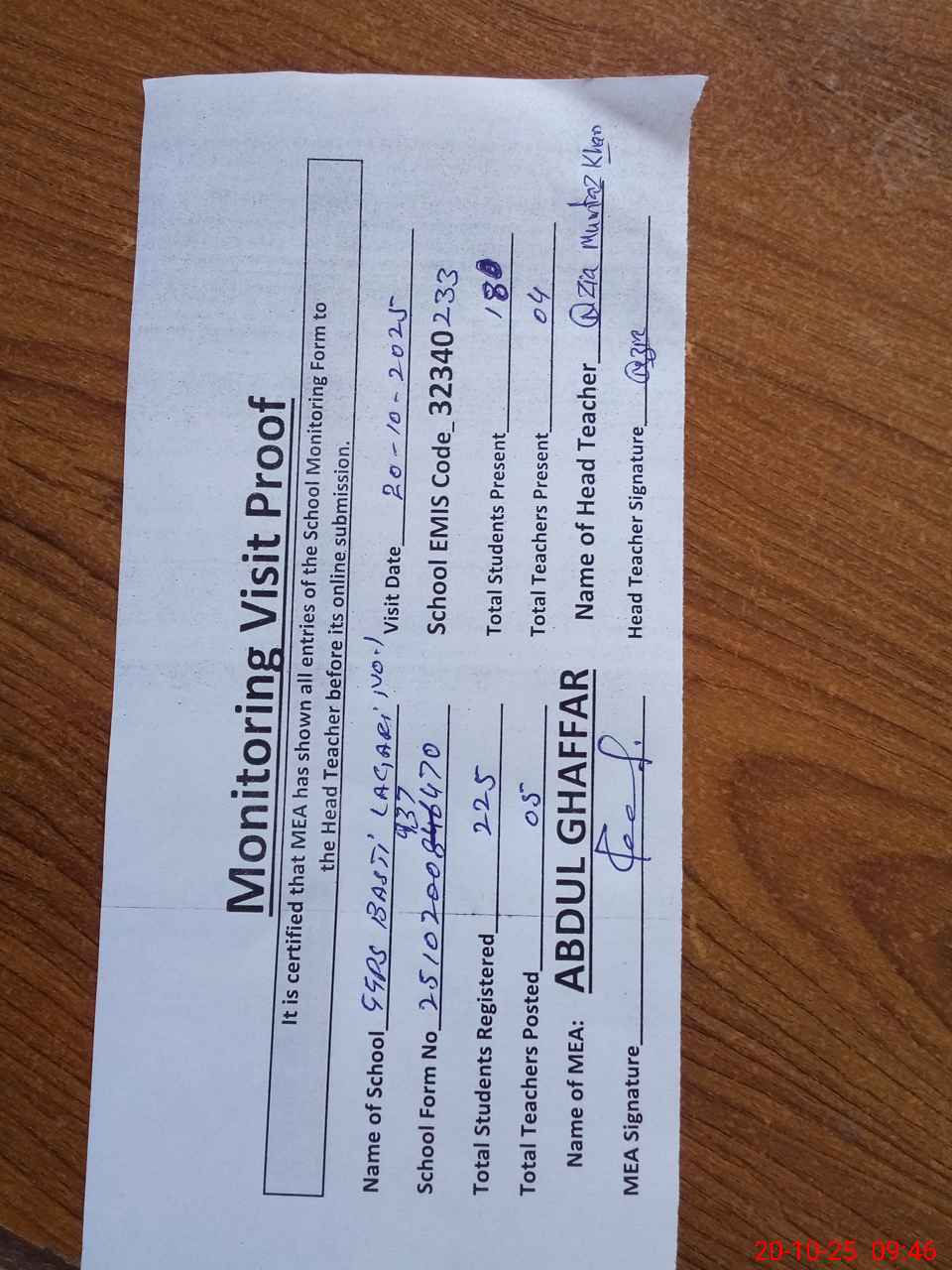 | Attendance Register | Head Teacher | MEA with School | Visit Proof |