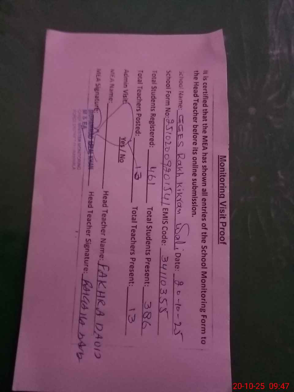 | Attendance Register | Head Teacher | MEA with School | Visit Proof |