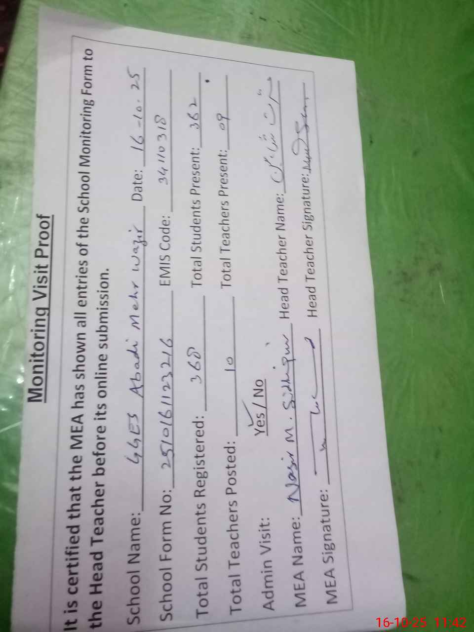 | Attendance Register | Head Teacher | MEA with School | Visit Proof |