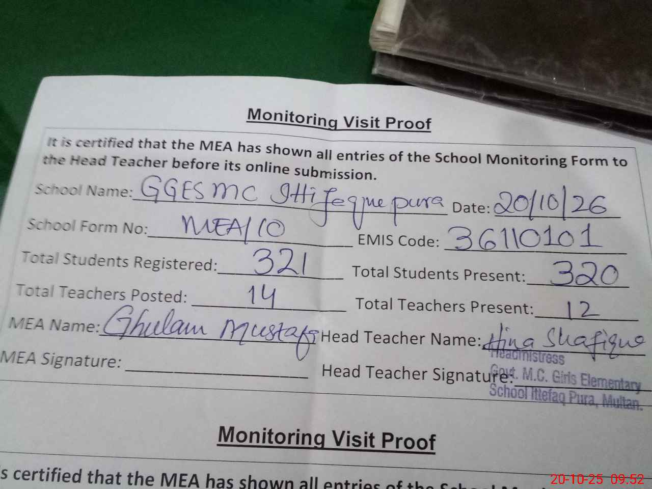 | Attendance Register | Head Teacher | MEA with School | Visit Proof |